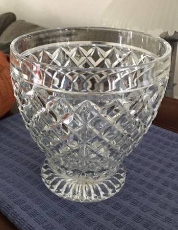 We are downsizing and offering this very heavy, beautiful crystal ice bucket (or vase) for sale as shown in first 2 photos. Eyeglasses are for scale. This heavy crystal piece measures about 7” tall and comes from a smoke free household. I am asking only $30. I have attached ads of similar pieces selling for much more and that is not including tax or shipping. If you are interested or would like more photos, please call landline show contact info